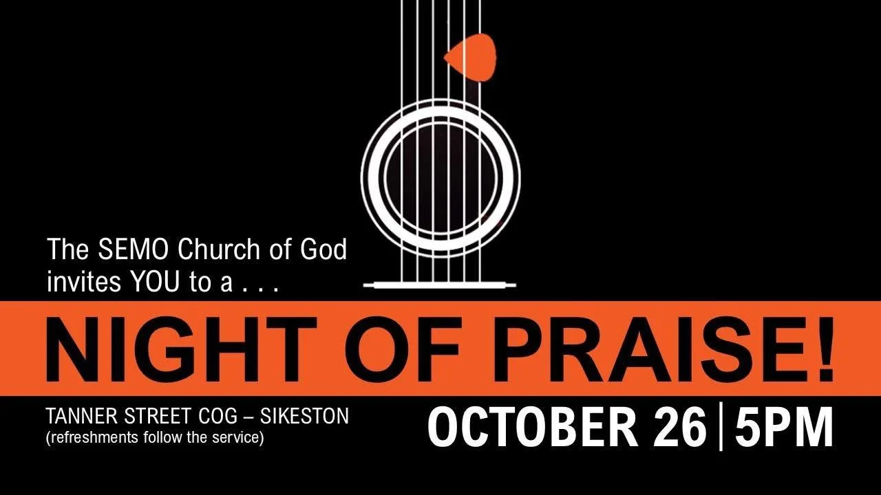Oct 26 SEMO COG Night of Praise Sunday, October 26, 2025 5:00 PM 6:00 PM Tanner Street Church of God (map) Google Calendar ICS View Event →